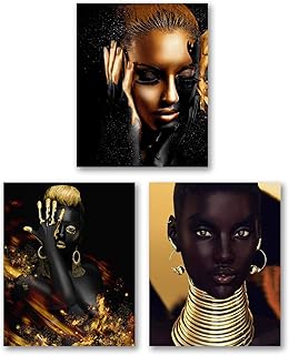 VOUORON アフリカ系アメリカン ウォールアート 絵画 ゴールデンイヤリング ネックレス ブラック 可愛いガールスタイル アートプリント 3枚セット (フレームなし、8 x 10インチ) クイーン ブラック 女性 部屋 ポスター 寝室 ホームデコレーション フレームなし