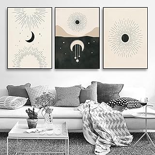抽象線 ウォールアート プリント 天体 ボヘミアン 太陽 月 星 キャンバスポスター 北欧 ポスター 壁 リビングルーム 絵画 装飾 フレームなし (16x24インチx3 フレームなし)