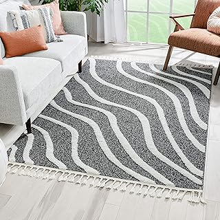 Well Woven Lynda ブラック | 波型ストライプ ハイローテクスチャ | 幾何学模様エリアラグ 8x10 (7フィート10インチ x 9フィート10インチ
